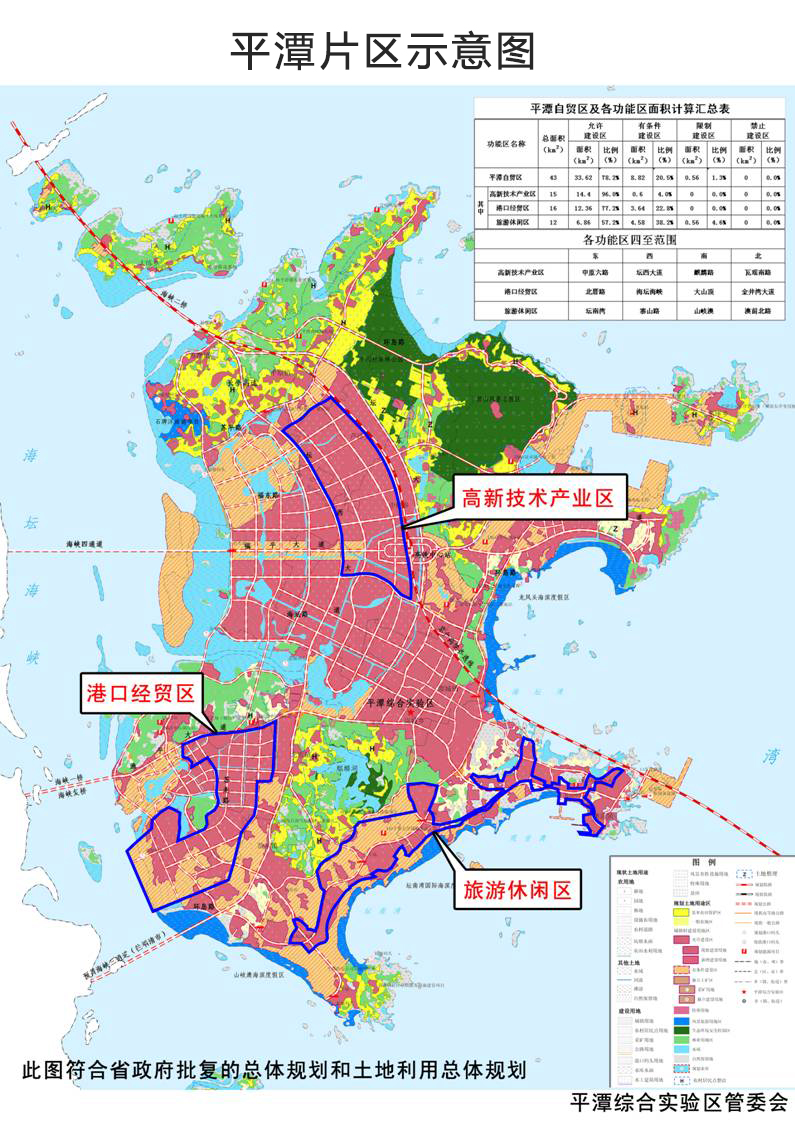• 中國(福建)自由貿易試驗區平潭片區總面積43平方公里。包括三個區塊:港口經貿區16平方公里;高新技術產業區15平方公里;旅游休閑區12平方公里。